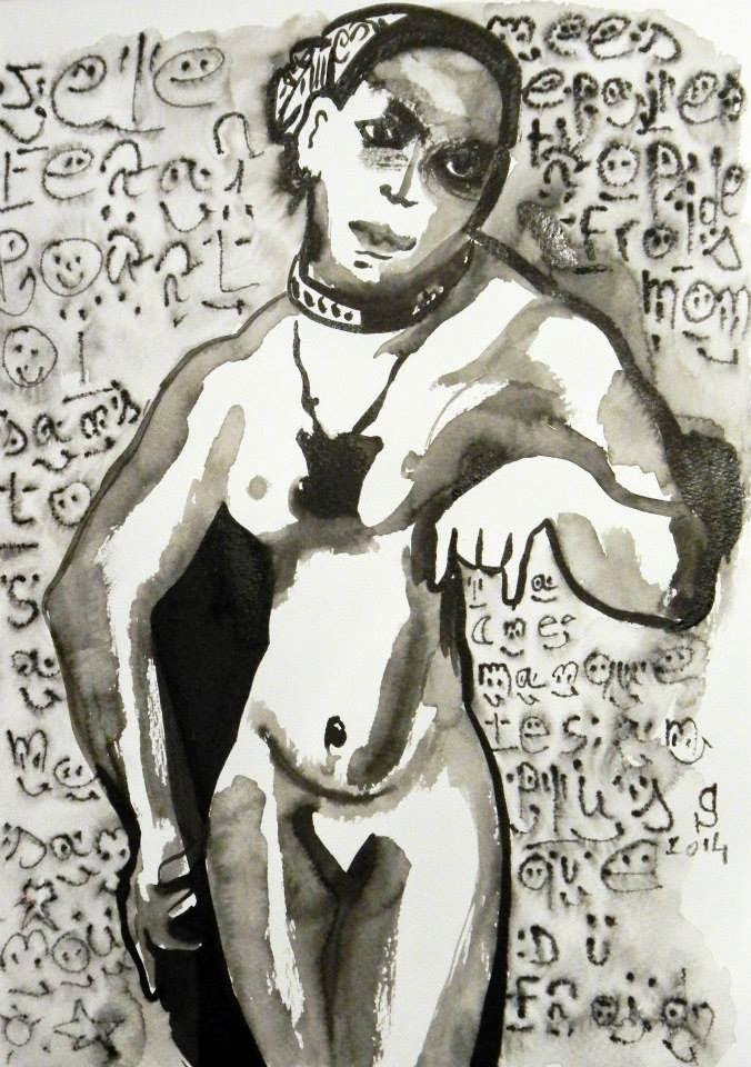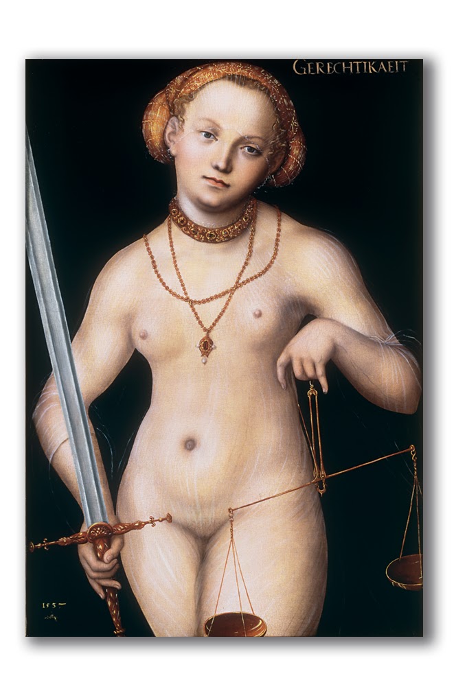 La renaissance allemande peut parfois prendre des airs de Heavy métal des années 70-80 mais là je vous propose une version plutôt graffiti Hip-hop de l’Allégorie de la Justice de Cranach (peinte en 1537). La main gauche du dessin, dépourvue de la balance fait penser au « Satan fingers » des métaleux et on peut imaginer un mur couvert de tags derrière la figure. J’aime ce registre anachronique et le côté mélancolique du visage.