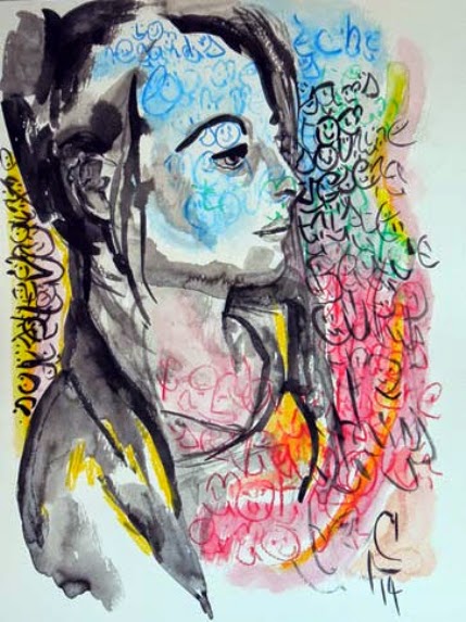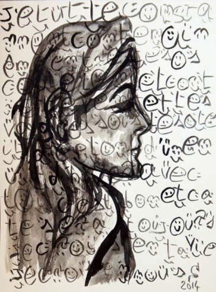 Ces trois dessins sont réalisés à l’encre de chine et aux crayons aquarellables sur du papier aquarelle de 30 x 40 cm. J’utilise des écritures et des symboles comme matière à part entière qui se mêle au portrait. Les mots, extraits de mes journaux intimes, s’enchevêtrent avec la profondeur et la transparence des couleurs. Ces portraits deviennent alors des palimpsestes personnels.